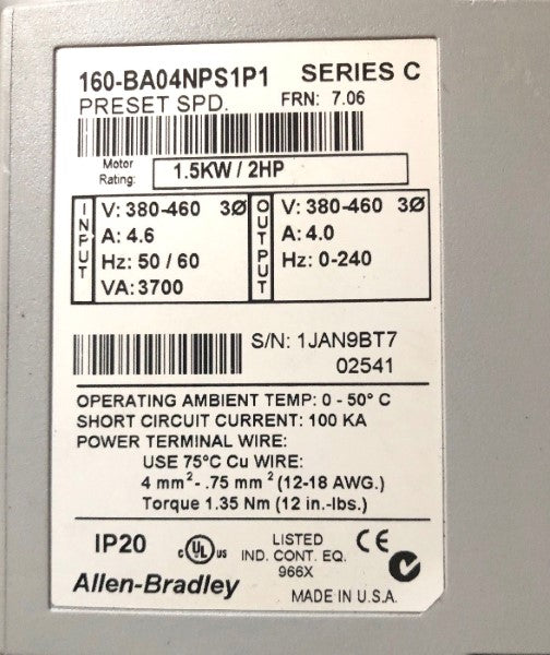 Allen Bradley via TCS 160BA04NPS1P1 Ser.C NSFP (BR/WH) 160 BA04NPS1P1